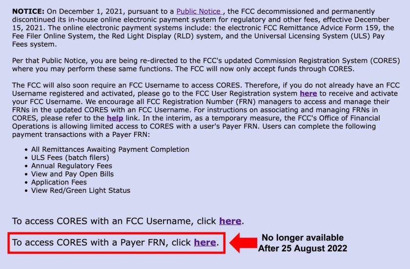 In a Public Notice issued on 27 May 2022 (attached), the FCC announced that Legacy CORES will be retired on July 15, 2022 at 6 pm.