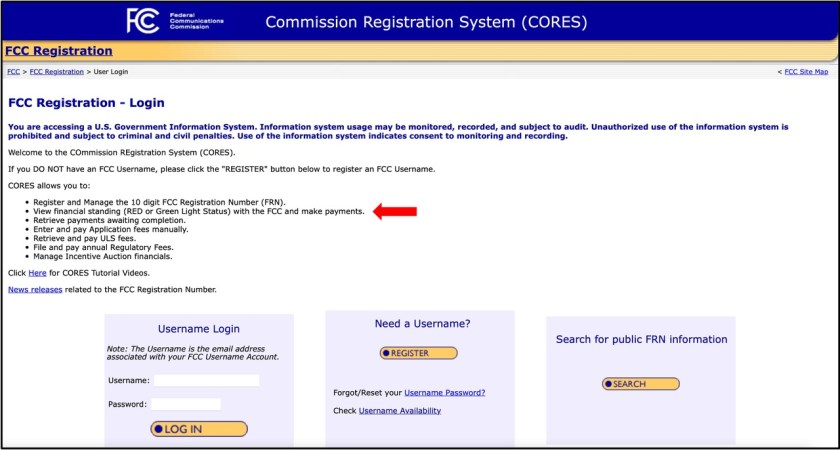 Users that need to pay annual regulatory fees, view Red Light status details, pay Universal Licensing System (ULS) fees, and complete payments for all FCC filings and fees will be required to use a username and password